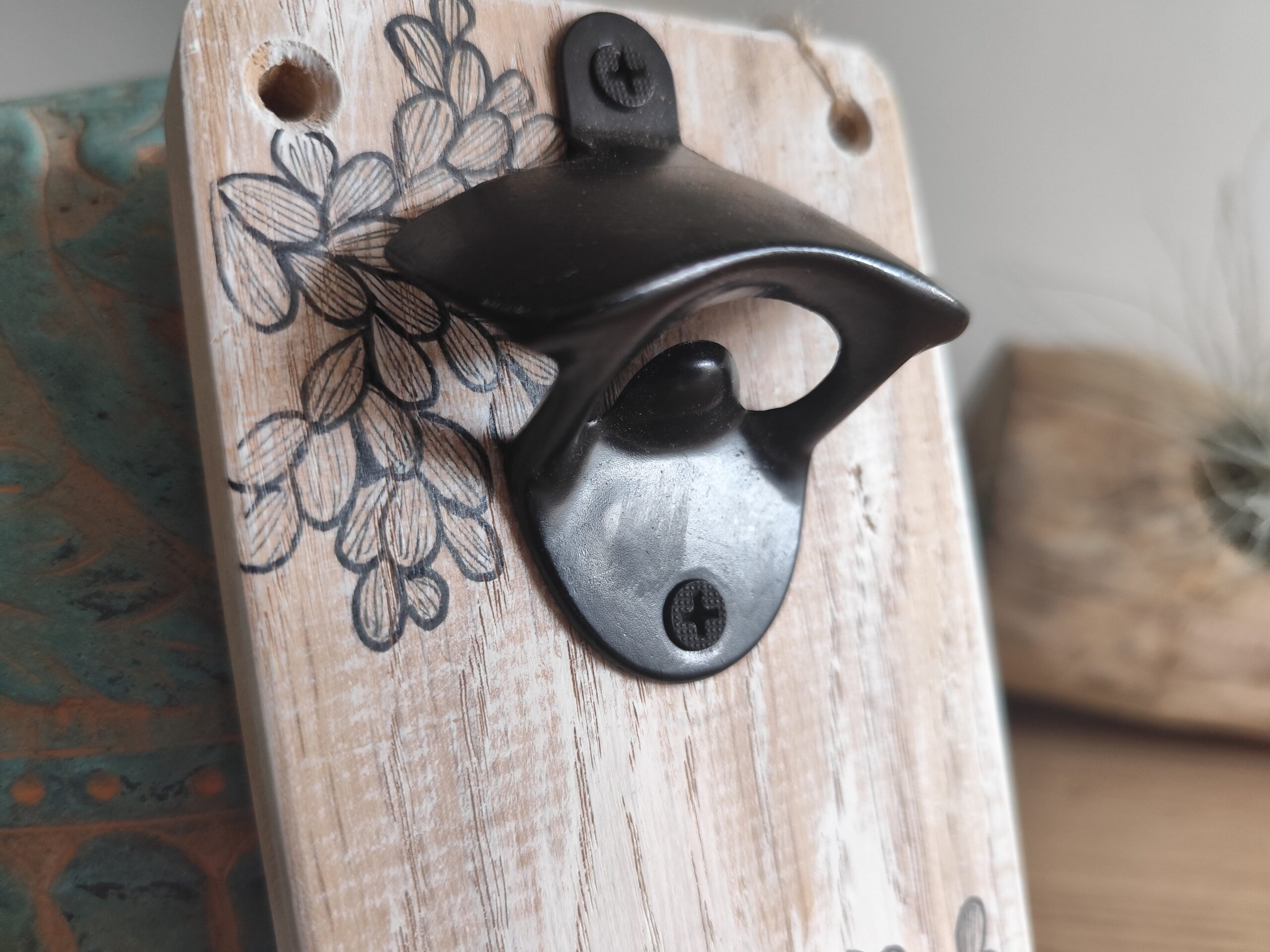 🍺 Décapsuleur mural en chêne massif – décor floral peint à la main